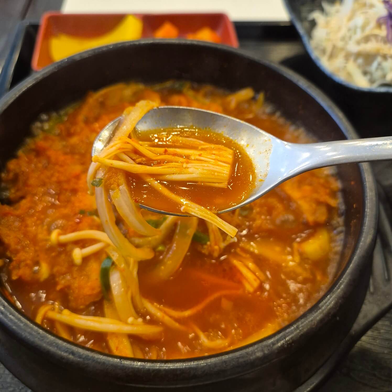 제가 주문한 돈카츠김치나베는 미소야의 대표 메뉴 중 하나인데, 진짜로 강력 추천하고 싶어요. 주문하고 조금 기다리니 뜨끈한 나베가 테이블에 나왔어요. 김치의 매콤한 향과 고소한 돈카츠의 냄새가 진짜 식욕을 자극하더라고요. 나베 안에는 돈카츠, 김치, 두부, 버섯, 다양한 야채들이 듬뿍 들어있었어요. 첫 숟가락을 뜨자마자 느껴지는 국물의 깊은 맛은 정말 놀라웠어요. 김치의 매콤함과 돈카츠의 고소함이 어우러져 입안 가득 풍미가 퍼지는 느낌이었어요.