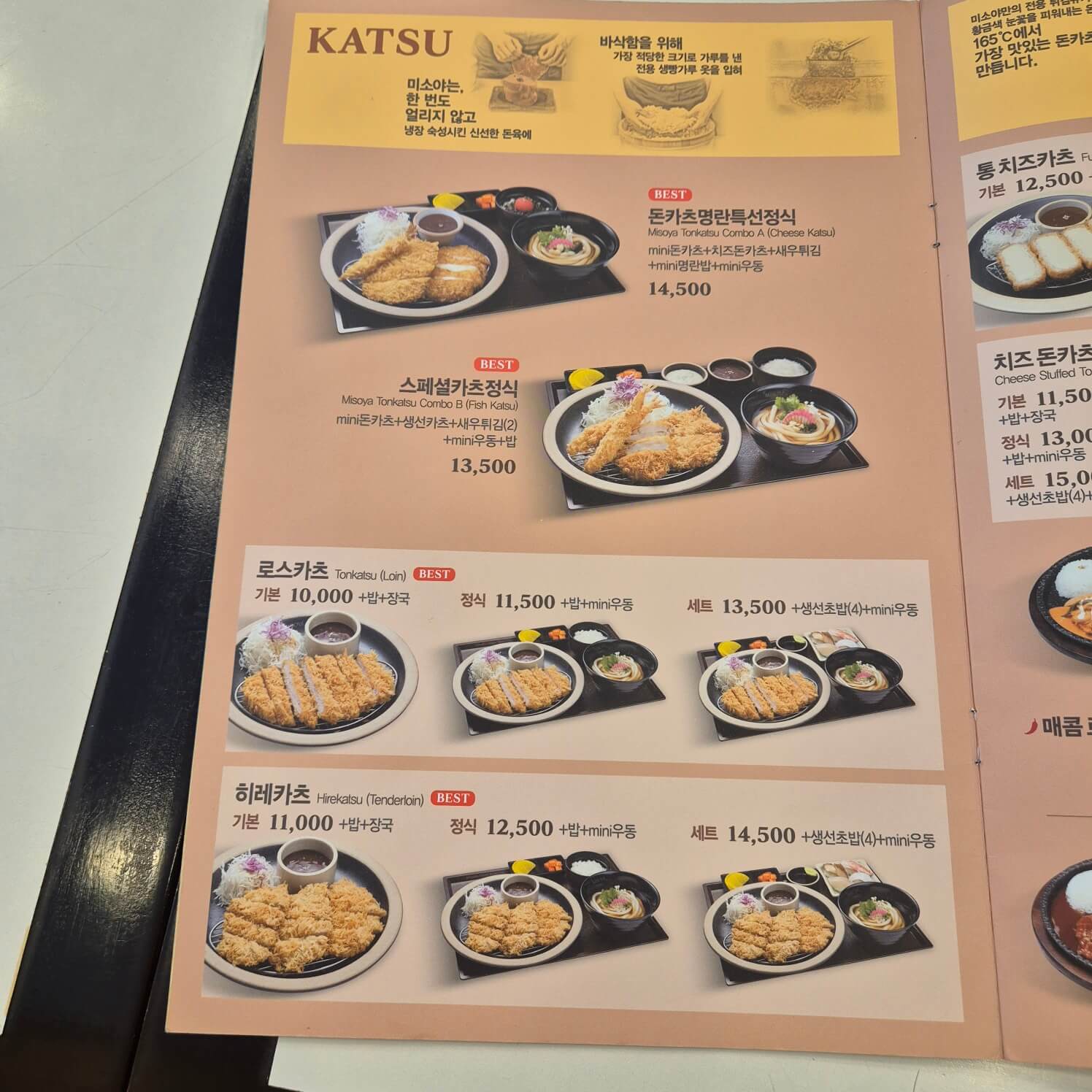 돈카츠가 대표 메뉴인 만큼 다양한 종류 돈까스가 있어서 선택지가 넓어요. 일본식 돈까스 좋아하시는 분은 꼭 미소야 방문하시길 추천합니다. 가격도 가성비 좋습니다.